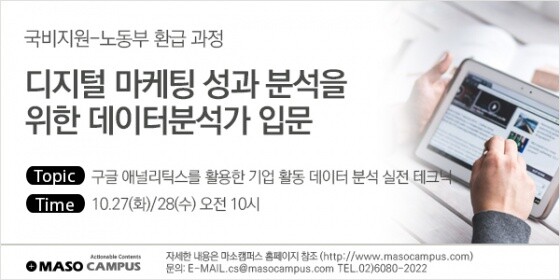 마소캠퍼스가 국비 지원으로 교육비의 일부가 환급되는 ‘디지털마케팅 성과분석을 위한 데이터 분석가 입문’ 강의를 10월 27, 28일 이틀에 걸쳐 진행한다고 밝혔다.