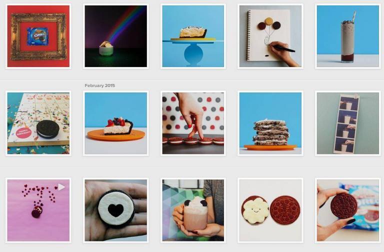 Oreo의 인스타그램 피드에서 볼 수 있듯이, 스타일, 색상 선택 및 필터 사용이 일관되어 더욱 포괄적인 브랜드 이미지를 만듭니다.