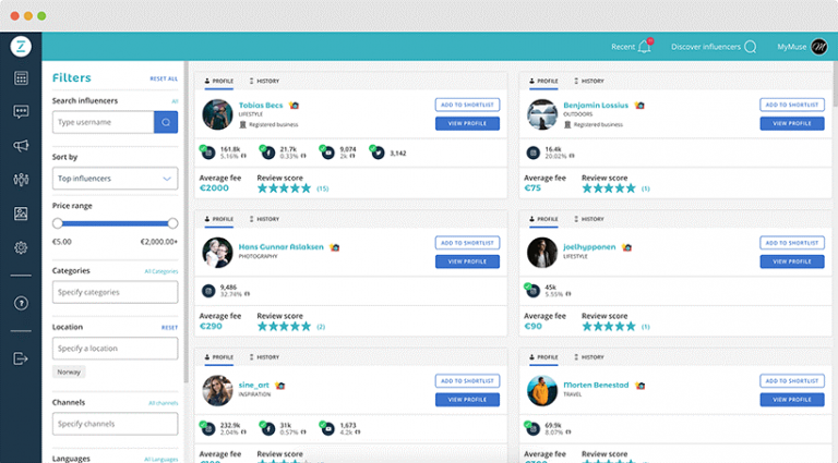 이 모든 것은 인플루언서를 찾아 접촉하는 것으로 시작합니다. Inzpire의 필터를 사용하여 그들의위치, 잠재고객 규모, 비용 등을 기반으로 인플루언서를 찾을 수 있습니다. 또한 그들의 참여도 통계와 잠재고객에 대한 정보도 볼 수 있습니다. 만약 관심 있는 인플루언서를 발견한다면, 최종후보자 목록 저장하거나 바로 캠페인에 추가하십시오.