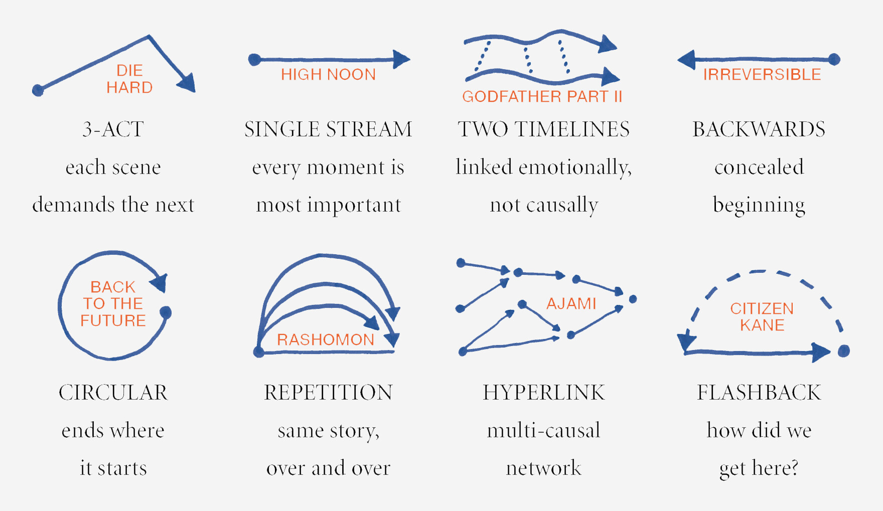 영화제작자들은 시청자의 관심을 유지하고 제작자들의 경험에 편향시키도록 흐름을 정확하게 관리합니다. 콘텐츠를 올바른 순서로 배열하는 것은 각 순간에 중요한 것을 눈에 띄게 만드는 데 도움이 됩니다. 아래의 다양한 플롯 구조들을 살펴봅시다. 각각은 고전 영화와 짝을 이루고 있습니다. :