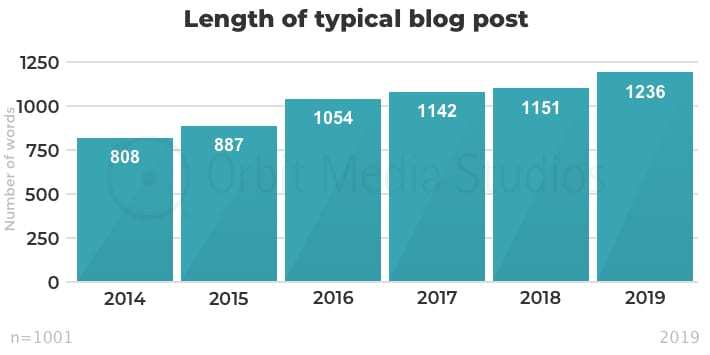 위의 그래프에서 볼 수 있듯이 블로그 게시물의 길이는 해가 갈수록 길어지고 있습니다.