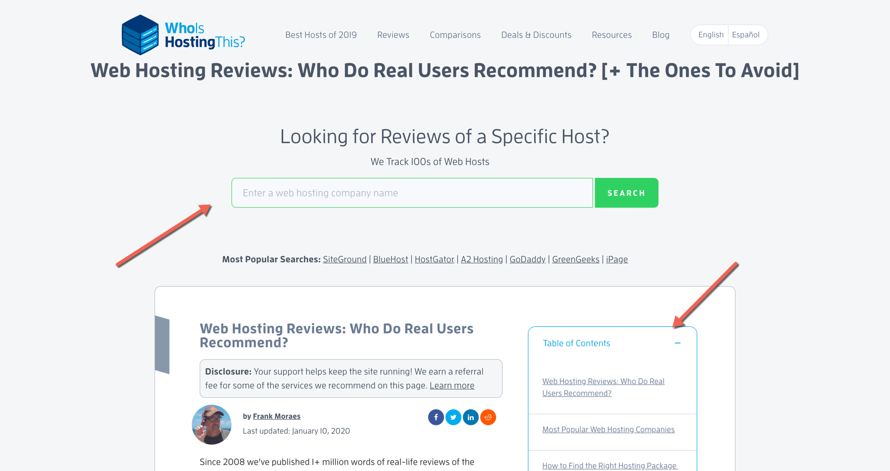 위에서 볼 수 있듯이 WhoIsHostingThis는 게시물을 검색하기 위한 검색 필드와 게시물의 다른 섹션을 빠르게 찾을 수 있는 목차와 같은 항목을 추가하여 게시물을 사용자 친화적으로 만들었습니다