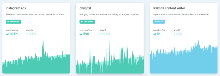 • 추세 또는 폭발적 주제 – 이러한 도구를 통해 특정 주제 또는 키워드에 대한 사용자의 관심을 확인할 수 있으며 기회를 강조할 수 있습니다.