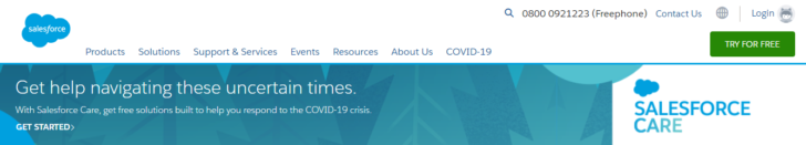 예를 들어, Salesforce는 영국 사이트 전체에 자사의 도구가 현재 비즈니스에 어떤 도움을 줄 수 있는지 홍보하는 배너를 가지고 있습니다.