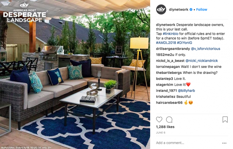 DIY 네트워크에서 올린 인스타그램 게시물은 훌륭한 예입니다. 이 브랜드는 잠재 고객의 관심사와 관련성이 높은 눈에 띄는 이미지를 사용하며, 캡션은 해당 콘테스트를 홍보합니다.