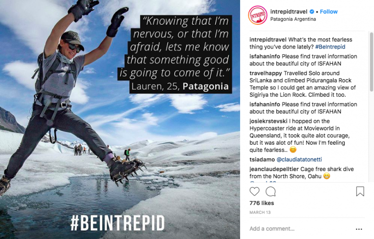 인트레피드 여행사(Intrepid Travel)는 읽기 쉽고 영감을 주는 텍스트와 함께 다채로운 이미지를 사용하여 관심을 끌고 공유를 장려합니다.
