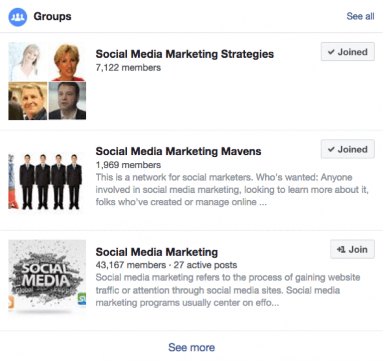 페이스북의 수억 개의 그룹 속에서, 이상적인 고객들로 가득한 네트워킹 그룹을 찾아 가입할 수 있습니다. 가장 적합한 그룹을 찾으려면 페이스북 검색창에 키워드를 입력하고 “그룹”탭을 클릭하십시오. 다음은 “소셜 미디어 마케팅” 키워드를 입력했을 때 얻은 결과 이미지입니다.