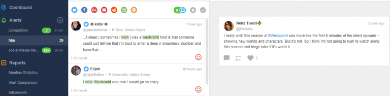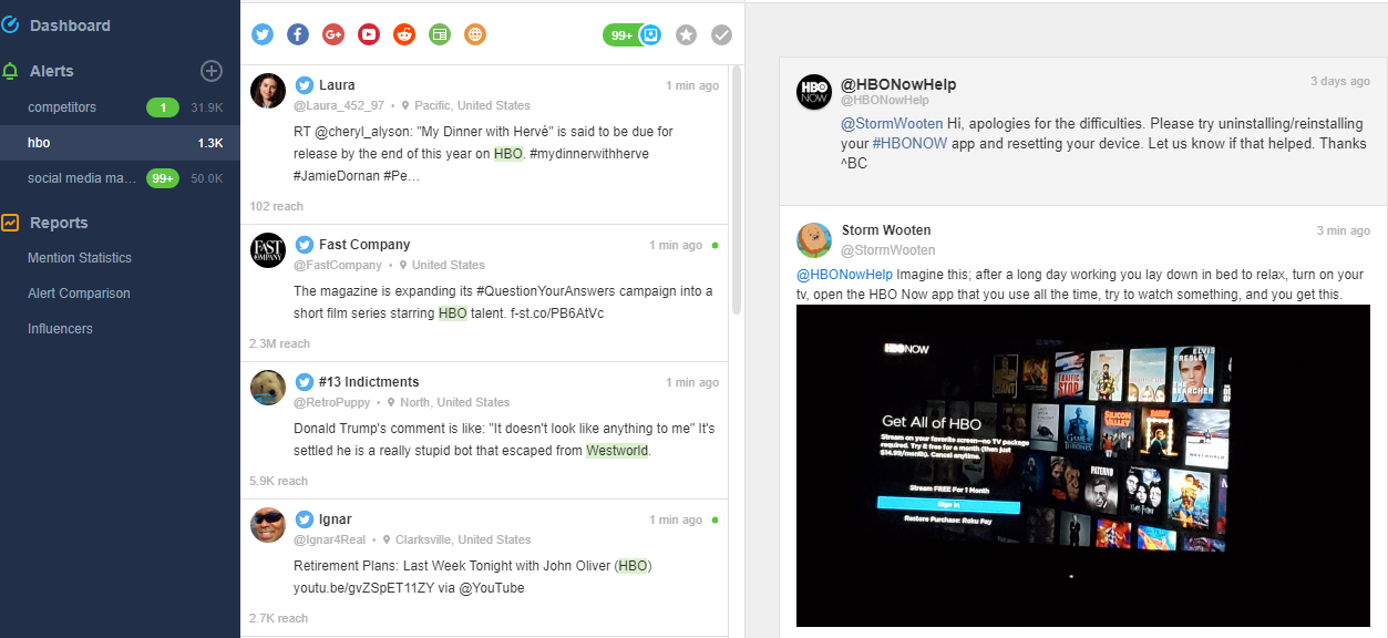 여러분이 HBO의 소셜 미디어 관리자로서 회사와 프로그램(왕좌의 게임, 웨스트 월드), 경쟁사(넷플릭스, 쇼타임 등)및 업계에 대한 언급을 모니터링하고자 한다고 가정해 봅시다.