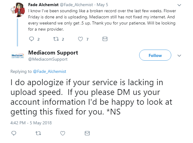 다음은 고객이 자신의 인터넷 서비스에 문제가 있다고 트윗을 남긴 Mediacom의 예입니다. Mediacom은 즉각적으로 대응하여 사과와 문제를 바로잡겠다는 약속을 전했습니다.