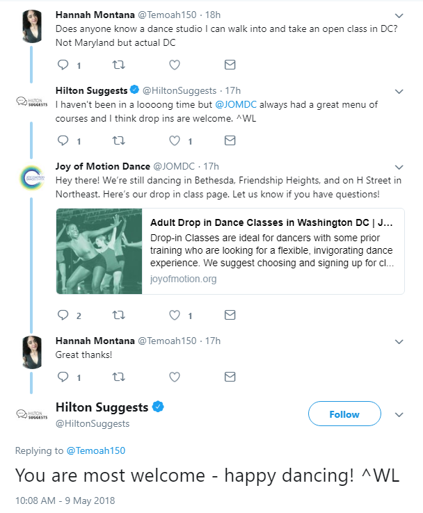 힐튼 호텔을 예로 들어 보겠습니다. 힐튼은 “휴가를 어디로 가야 할까요?”와 같은 쿼리를 모니터링하여 잠재 고객을 정기적으로 찾습니다. 그런 다음 유용한 조언을 제공합니다. 심지어 힐튼 직원들이 그 지역의 흥미로운 공간을 추천하기 위해 사람들에게 접근하는 @HiltonSuggests 프로그램을 시작했습니다.