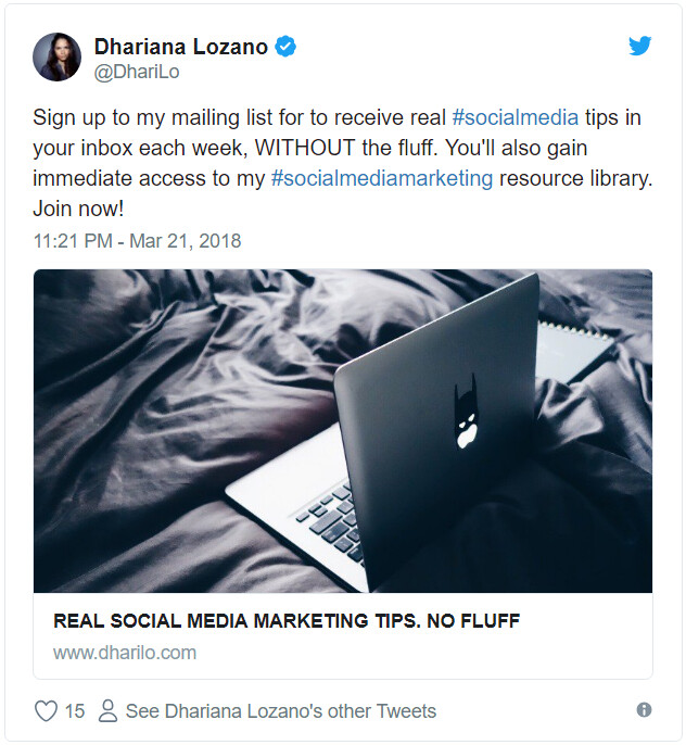 아래의 예는 팔로워들에게 리스트 가입을 요청하고 콘텐츠 입니다. 트위터에서는 트위터 카드를 이용한 반면, 페이스북에서는 이미지와 링크를 캡션에 사용했고 문구를 약간 수정했습니다.