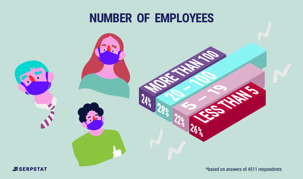 미국, 독일, 스페인, 그리고 다른 유럽 국가의 4,500명 이상의 응답자들이 익명 조사에 참여했습니다. 이들은 중소기업, 기관 또는 팀에서 근무하거나 운영하는 디지털 마케팅 전문가를 포함하는 Serpstat 플랫폼 사용자입니다. 틈새 프리랜서들도 응답자 중 하나였다.