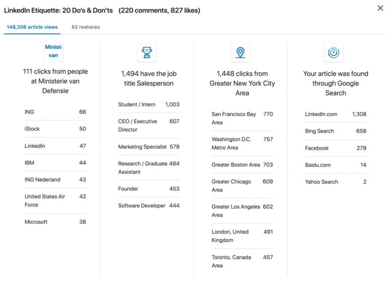 예를 들어 링크드인에서는 얼마나 많은 사람들이 여러분의 상태 업데이트 및 링크드인 퍼블리셔 게시물을 보고 상호작용 하는지와 동시에 잠재 고객에 대해 수집할 수 있는 일반 정보를 쉽게 볼 수 있습니다. 당신의 콘텐츠를 보고 있는 직원이 가장 많은 회사들, 가장 흔한 직위, 사람들이 어디 출신이고 그 게시물이 어떻게 발견되었는지와 같은 것들 말입니다.