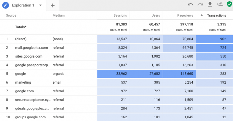 또한, 탐색 보고서는 원형 그래프, 선형 그래프, 막대 그래프, 일반 텍스트 또는 히트 맵(heatmap) 시각화와 같은 시각화 기회도 제공함으로써(아래 스크린샷 참조) 기존 피벗 테이블 분석을 넘어섭니다. 예를 들어, 이제 가장 많은 거래를 야기한 소스(들)와 매체(들)를 빠르게 시각화하고, 버튼을 눌러 데이터를 구글 스프레드시트(Google Sheet)로 내보내거나, 링크를 동료 마케팅 담당자와 공유할 수 있습니다.