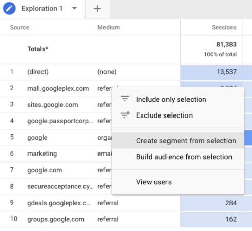 이 데이터를 사용하면, 참조(referral)가 특히 googleplex.com.에서 매우 잘 대처하고 있음을 알 수 있습니다. 하지만 우리는 이 관찰에 대해 어떻게 행동해야 할까요? 고급 분석을 통해 다시 한번 문제를 해결할 수 있습니다. “mall.googleplex.com”이 있는 행을 마우스 오른쪽 버튼으로 클릭하면, 선택 항목에서 세그먼트를 만들거나 데이터에서 리마케팅할 잠재고객을 구축할 수도 있습니다
