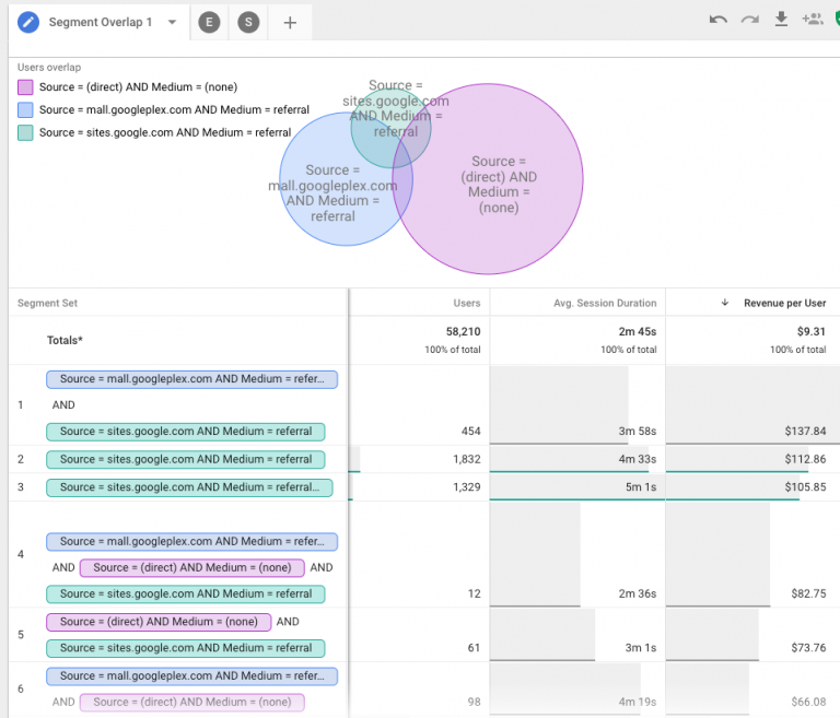 탐색 보고서에서 보았듯이 세그먼트 오버랩 도구는 이전의 구글 애널리틱스에서 시각화할 수 있었던 것을 넘어섭니다. 이 도구는 탐색 보고서, 유입 경로 보고서 기능 또는 구글 애널리틱스 내의 세그먼트를 사용하여 새 세그먼트를 만든 경우에 특히 유용합니다.