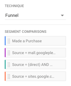 이제 탐색 보고서의 소스/매체 예를 사용하여(소스=mail.googleplex.com 그리고 매체=참조), 다른상위 거래 세그먼트 (직접/없음)과 (site.google.com/referral)와 비교해 보겠습니다. 탐색 보고서 내에 이러한 세그먼트를 생성함으로써, 고급 분석은 세그먼트를 왼쪽 변수 열에 배치합니다. 새로운 세그먼트 오버랩 보고서로 끌어다 놓기만 하면 됩니다.