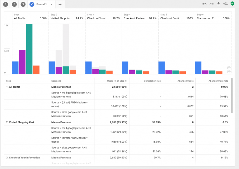 유입 경로 도구를 사용하면, 앞에서 설명한 오른쪽 클릭 방법을 사용하여 하위 세그먼트를 계속 만들 수 있습니다. 이러한 추가적인 세분화 기회를 통해 사이트 전반에 걸친 페르소나와 구매자 유형을 더 잘 이해할 수 있게 됩니다. 우리의 각 단계의 완료와 이탈 비율을 관찰하기 위해 마케팅과 판매에 대한 정보를 제공하면서 유입 경로 보고서 하단의 완료율과 이탈률을 이용할 수 있습니다.