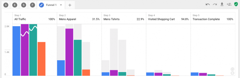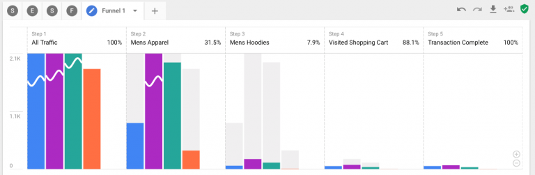 트렌드를 찾아낼 수 있는지 보기 위해 남성 의류를 자세히 살펴봅시다. 여기서, 우리는 남성 의류, 남성용 티셔츠, 그리고 쇼핑 완료를 위한 유입 경로 단계를 만들었습니다. 또한, 티셔츠를 후드티로 교체하여 우리의 트렌드가 제품 전반에 걸쳐 유효한지 확인합니다.