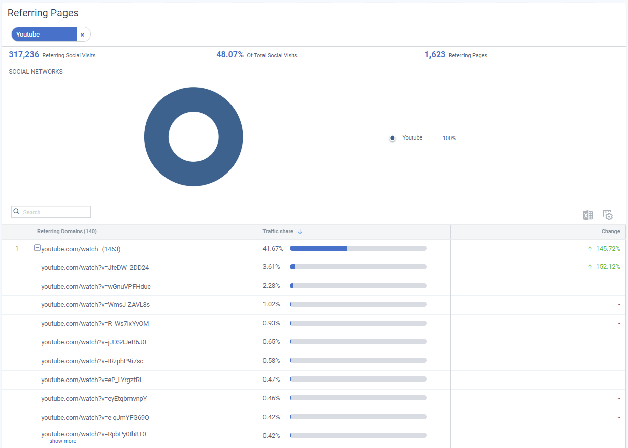 SimilarWeb은 트래픽 소스로써 소셜미디어의 중요성에 대한 통찰력을 제공 할뿐만 아니라 사이트에 대한 트래픽을 생성하는 개별 플랫폼 및 심지어 작동되는 특정 콘텐츠에 대한 정보를 제공합니다. 이는 경쟁 업체와 협력하는 특정 인플루언서를 파악하고 그러한 관계가 가질 수 있는 영향에 대해 더 많이 배울 수 있으며, 인플루언서를 비즈니스의 잠재적 파트너로 식별하는 데 도움이 되는 귀중한 도구입니다.
