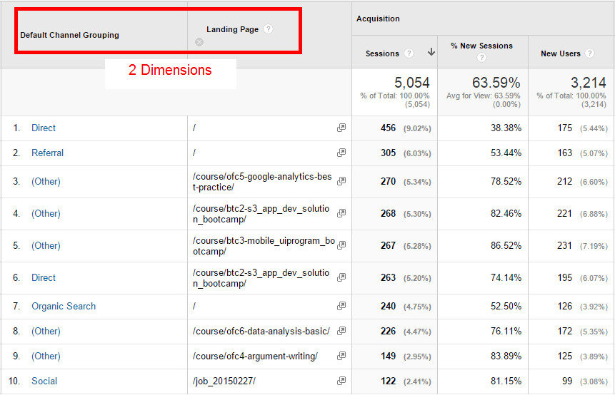 - ‘Standard table filters’ : 구글 애널리틱스의 기본 보고서에서 분석을 위해 적용된 최초의 관점이라고 할 수 있는 첫번째 ‘Dimension’을 의미하며, ‘View’에 쌓여 있는 전체 데이터를 이 관점으로 데이터를 구분해서 보고서를 보여주는 것을 말한다.