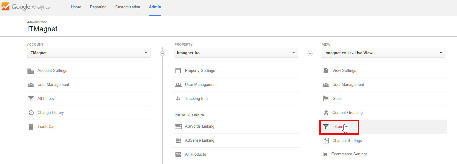 “뷰 필터”란 여러분의 구글 애널리틱스 계정에 구글 애널리틱스 데이터가 저장되기 전에 반영되는 필터를 말하며, “뷰 필터”를 설정하려면 [그림3]처럼 구글 애널리틱스 “어드민” 화면의 ‘필터스(Filters)’ 메뉴에서 셋업함으로써 설정 가능하며, 구글 애널리틱스의 실질적인 데이터가 저장되는 ‘뷰(View)’의 모든 데이터에 영구적으로 반영된다. 이 아티클에서는 “뷰 필터”에 대해서는 기본적인 개념정도만 다루려고 하며, 좀더 자세한 내용이나 예제 등에 대해서는 “구글 애널리틱스 Profile Filters에 대한 모든 것” 아티클을 참조하기 바란다.