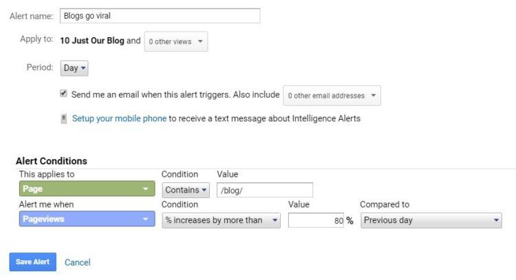 유감스럽게도, 구글 애널리틱스에게 “바이럴 되면 알려 줘” 또는 “모든 것이 중단되면 알려줘”라고 말할 수는 없습니다. 먼저 구글 애널리틱스 데이터를 기준으로 이러한 상황을 구글 애널리틱스의 용어로 정의해야 합니다. 그렇다면, 바이럴이 일어난 상황을 어떻게 정의하고 싶습니까? ‘일간 또는 주간 트래픽 증가율’ 같은 방식으로 “모든 것이 중단되면 알려 줘”도 해결할 수 있습니다. 대신, 우리는 일간 트래픽이 100% 감소한 상황을 살펴볼 것입니다.