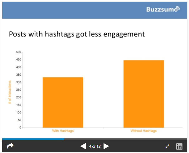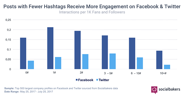 하지만 지금까지, 해시태그가 참여도에 미치는 영향은 엇갈리고 있습니다. 10억 개의 페이스북 게시물을 분석한 버즈수모(Buzzsumo)의 이 보고서와 같은 몇몇 보고에 따르면, 해시태그를 가진 게시물이 참여도가 낮았음을 알게 되었습니다.
