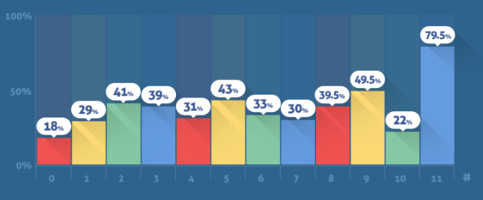 퀵스프라우트(Quicksprout)의 연구는 인스타그램에서 11개의 해시태그를 가진 게시물의 참여도가 가장 높다(79.5%)는 사실을 보여줍니다.