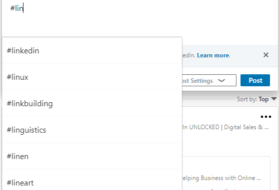 해시태그는 여기서도 내용을 분류하는 데 사용됩니다. 게시물에 추가하려면 ‘#’기호를 누르고 추가할 단어를 입력하십시오. 링크드인에서 관련성이 높고 인기 있는 해시 태그를 제안하고 선택할 수 있습니다.