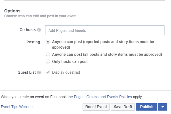 일부 기업들은 페이스북 이벤트에 대한 댓글을 절제하고 싶어 할 것인데, 이는 사람들이 이벤트에 대해 글을 올릴 수 없다는 것을 의미합니다. 여러분의 이벤트가 어떤 식으로 논란이 되지 않는 이상, 이는 아마도 좋지 않은 생각일 것입니다.