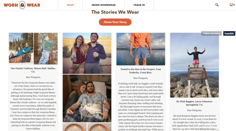 Patagonia는 고객의 평가를 공유하는 것에 훌륭합니다. 고객들은 WornWear 의류와 관련하여 자신의 이야기를 공유하는 것을 장려 받으며, 독자들은 이야기를 통해 따뜻함을 느끼게 됩니다.