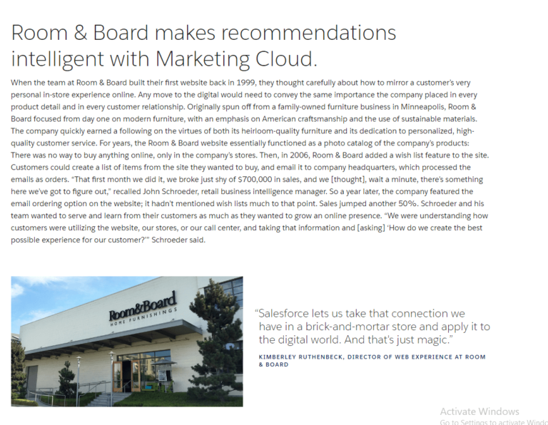 Salesforce는 벽돌과 박격포 가구 사업인 Room & Board가 어떻게 온라인상에서 고객에게 개인적인 매장 경험을 제공 할 수 있었는지에 대한 이야기를 공유한 것을 통해 이러한 현실을 포착했습니다.