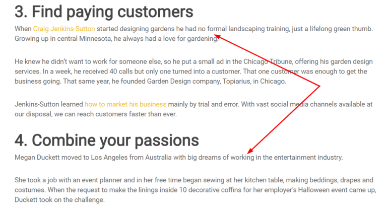 예를 들어, 위의 사진은 어떻게 취미를 수익성 있는 사업으로 바꾸는 방법에 대해 쓴 기사입니다. 5가지의 요점을 만들어 각각 다른 이야기를 엮었습니다. 그리고 그 이야기를 사용함으로써 독자들은 내가 이야기하고자 하는 요점을 이해하기가 더 쉽다는 것을 알게 되었습니다. 이러한 요점을 이해함으로써 궁극적으로 독자를 리드로 전환시키는 컨텐츠 마케팅 방법에 대해 설명할 수 있었습니다.