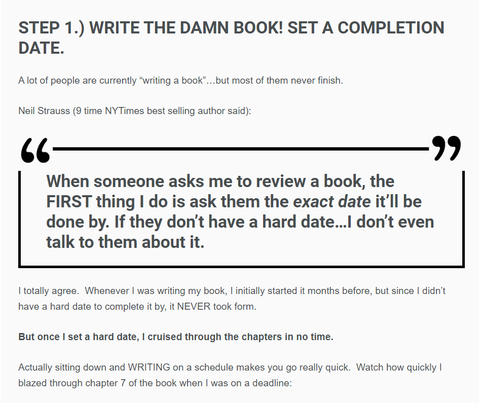 Neville Medhora의 블로그 게시물의 ‘무료로 온라인에 책을 출판하는 방법’을 통해 다른 예를 확인하십시오. 이 블로그 게시물에서 그는 자신의 책을 어떻게 쓸 수 있었는지 공유합니다. 그가 책의 완성 날짜를 설정한 방법을 참조할 수 있습니다.