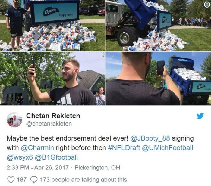 대담한 트윗과 유머러스한 말장난으로 잘 알려 진 샤르민(Charmin)이 대표적인 예입니다. 작년에 그들은 보증 계약의 일환으로 NFL선수인 제이크 버트(Jake Butt)에게 화장지 한 트럭을 배달했습니다. 이보다 더 당돌할 수는 없습니다.