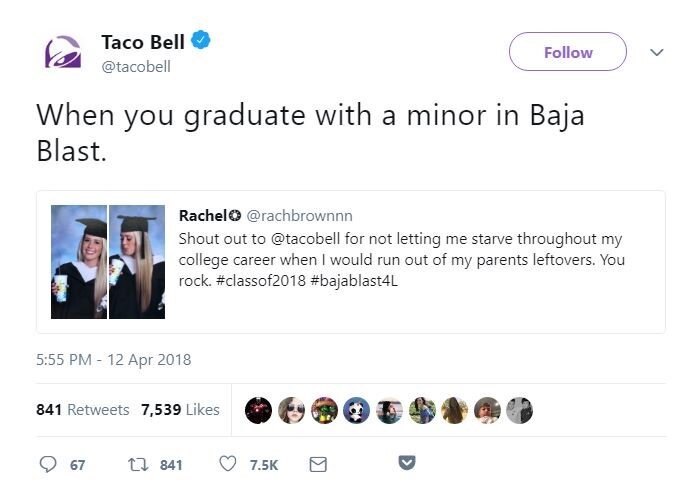 타코벨 또한 이러한 트윗을 즐기는 것을 좋아합니다. 그들의 가장 큰 팬들 중 일부는 대학생들입니다.