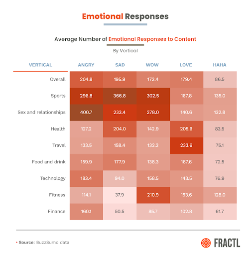 최근 프랙틀 연구에서는 최소 25개의 백링크를 획득한 5,000개 이상의 콘텐츠를 조사했습니다. 그리고 각 콘텐츠 틈새에서 어떤 페이스북 반응이 더 많은지 알아봤습니다.