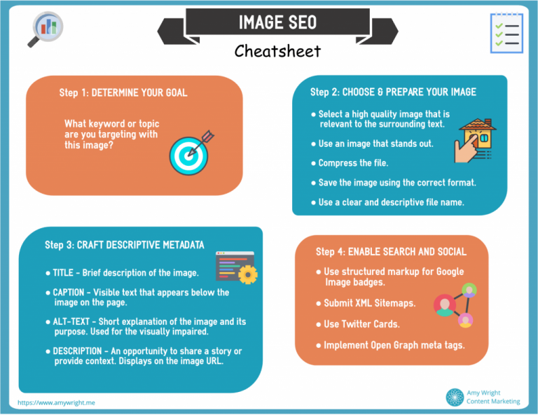 이미지 SEO가 어떻게 사용자 환경을 개선하고 가시성을 높일 수 있는지 이해하게 되었으므로, 이제 어떻게 구현할 수 있는지 궁금할 것입니다. 하지만 자세히 살펴보기 전에 나중에 쉽게 참고할 수 있도록 저장할 수 있는 치트시트가 여기 있습니다.