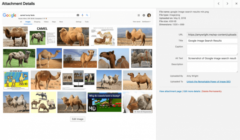 이미지는 사이트의 첨부 페이지로 저장되고 고유한 URL이 할당됩니다. 기술적인 메타 데이터는 이 페이지를 찾거나 클릭하는 모든 사용자를 위해 여러분의 이미지에 대한 추가적인 흥미로운 정보를 더할 수 있는 기회입니다.