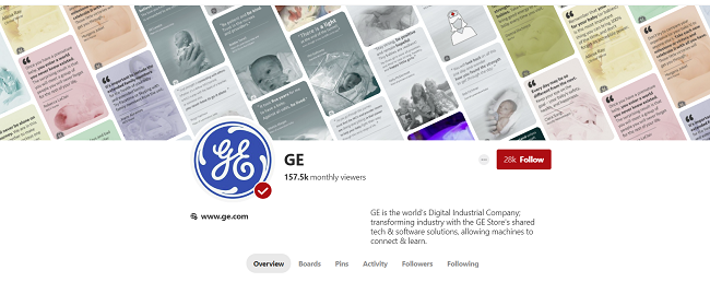 예를 들어, 제너럴 일렉트릭(General Electric)은 핀터레스트에서 매우 활동적이고 매력적인 존재감을 갖고 있습니다.