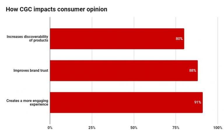 바자보이스의 조사 결과에 따르면 소비자의 80% 이상이 CGC가 제품 검색 가능성을 높이고 브랜드 신뢰도를 높이며 보다 매력적인 경험을 선사한다고 응답한 반면, 56%는 제품 등급, 소셜 미디어 사진 및 기타 소비자 생성 콘텐츠를 보는 것이 중요하다고 답했습니다.