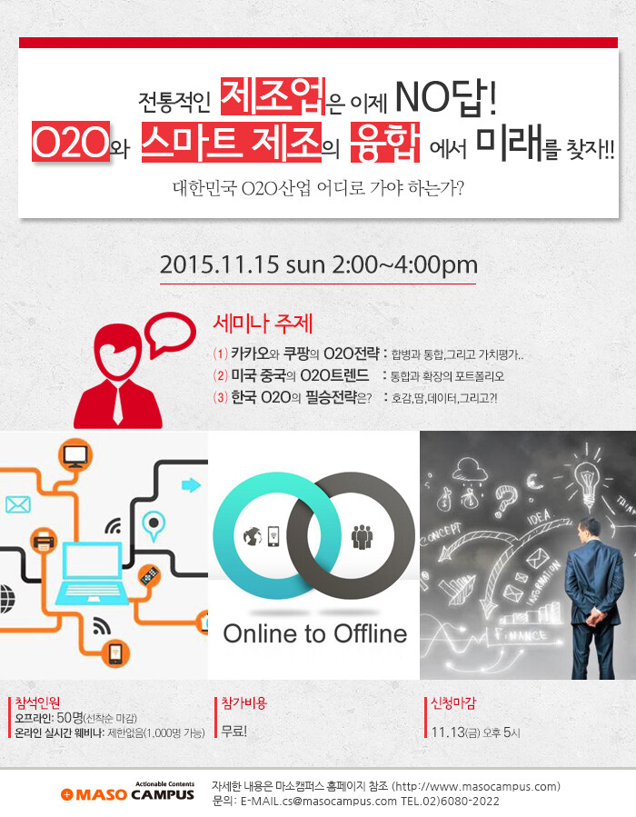 정주용 칼럼리스트는 “IT 기술의 발전이 우리 삶에 깊숙이 파고 들면서 전통적인 제조업으로는 답이 나오지 않는다는 걸 이미 현장에서는 뼈저리게 느끼고 있다”며 “이번 세미나는 앞이 깜깜하고 속이 답답한 사람들에게 O2O와 스마트 제조의 융합을 통한 미래를 보여주는 자리가 될 것”이라고 밝혔다.