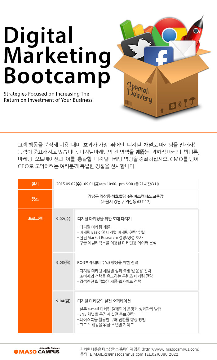 이번 교육에서는 디지털마케팅 전반에 걸친 과학적인 방법론을 △마켓 트렌드의 변화와 실무에 필요한 역량 △디지털마케팅의 채널 도출과 전략 수립 △실전 마케팅 리서치 진행 실습 △구글 애널리틱스를 활용한 Data-Driven 마케팅 △디지털마케팅 채널별 성과측정과 적합한 채널을 선택하는 KPI △고객의 선택을 넛지하는 콘텐츠 마케팅 기법 △검색엔진 최적화 마케팅 기법 △MailChimp를 활용한 이메일마케팅 실무 △SNS의 특징과 마케팅 툴로 활용하는 방법 △페이스북의 기업용 기능을 활용한 전환률 향상 △그로스 해킹의 이론과 적용 프로세스 총 11가지 주제로 나눠 다룬다.