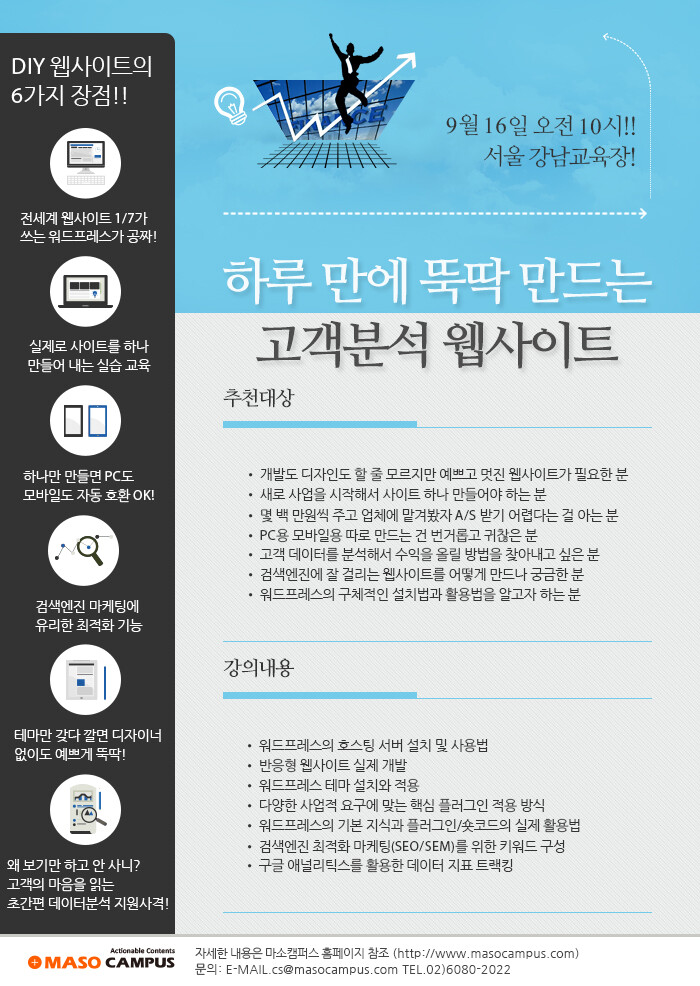 마소캠퍼스가 워드프레스를 다운 받아 설치하는 것부터 홈페이지 제작과 검색엔진 최적화 마케팅, 워드프레스 사이트에 구글 애널리틱스 추적 코드를 삽입해 고객 데이터를 분석해내는 전 과정을 다루는 '하루 만에 만드는 고객분석 웹사이트' 실습 프로그램을 마련했다.