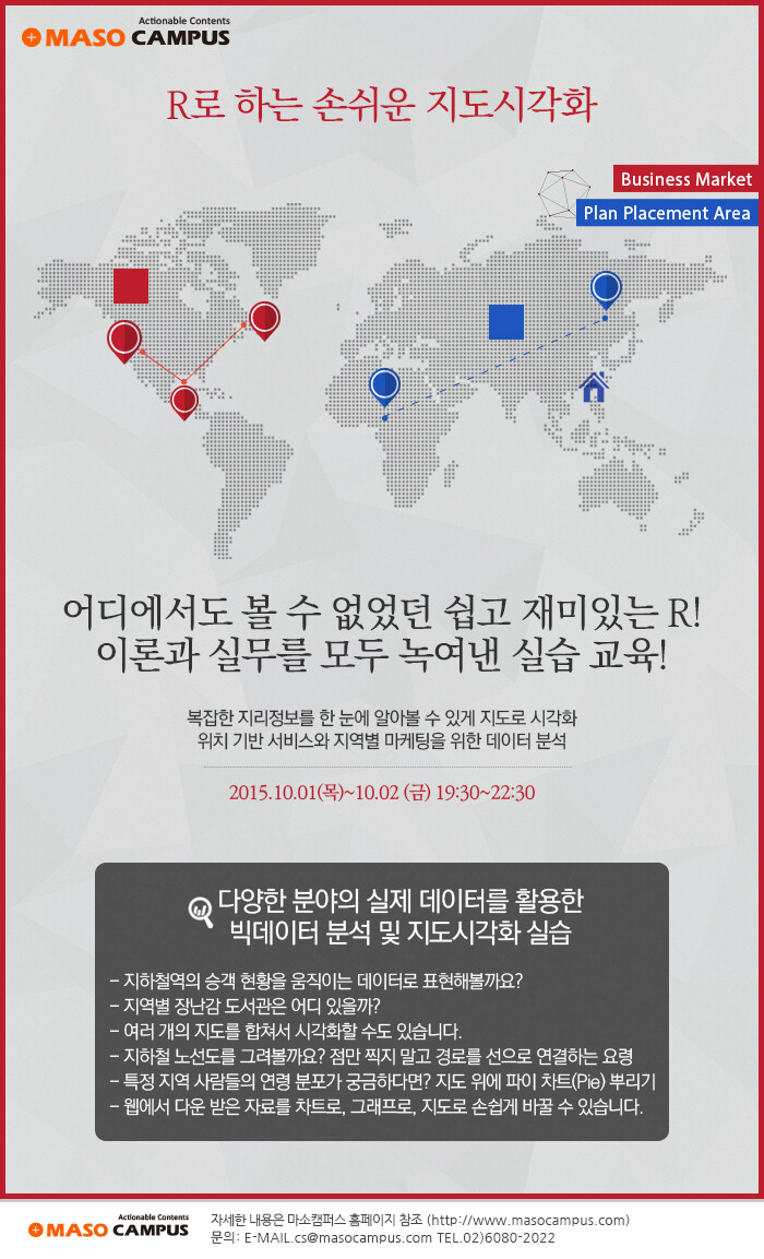 ‘R로 하는 손쉬운 지도 시각화’는 철저한 실습 위주 교육으로 진행된다. 수강생은 지하철 정보나 공영주차장, 장난감도서관 위치, 지역별 인구와 산업 통계 등 방대한 공공 데이터를 찾아 차트와 그래프로 변환하는 방법, 지도 위에 뿌리는 방법, 2개 이상의 지도와 데이터를 결합해 표현하는 방법 등을 배울 수 있다. 또 지하철 2호선 강남역의 시간대별 이용객 현황, 월별 품목별 판매 동향 등을 움직이는 차트로 표현하고 지도를 연결시키는 등 현업에 도움 되는 실무 기술을 익힐 수 있다.