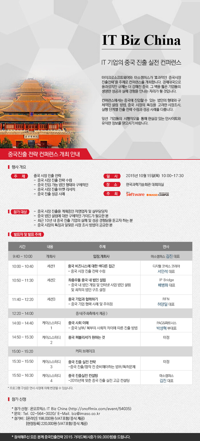 10월 15일 서울시 강남구 한국과학기술회관 대회의실에서 IT Biz China가 열린다. 기업의 권리를 지키면서 중국 현지 시장을 뚫고 들어가는 제대로 된 방법과, 양국의 자본과 기술 그리고 인력을 깊숙이 섞으면서도 현지 기업과의 차별화를 유지하는 요령, 광활한 대륙의 시장을 성공적으로 정복하기 위한 구체적인 노하우와 더불어 실행 단계별 진출 전략 수립과 성공 사례를 소개한다.