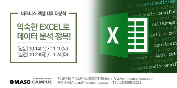 엑셀(Excel) 활용 데이터 분석 과정에서는 엑셀을 BI 툴로 활용하는 법과 데이터 분석, 시각화, VBA 등을 전 세계 110명, 국내에 5명뿐인 ‘마이크로소프트 오피스 엑셀 MVP(Microsoft Office Excel MVP)’로 8년째 활동해온 김철 엑셀 전문가가 강의한다.