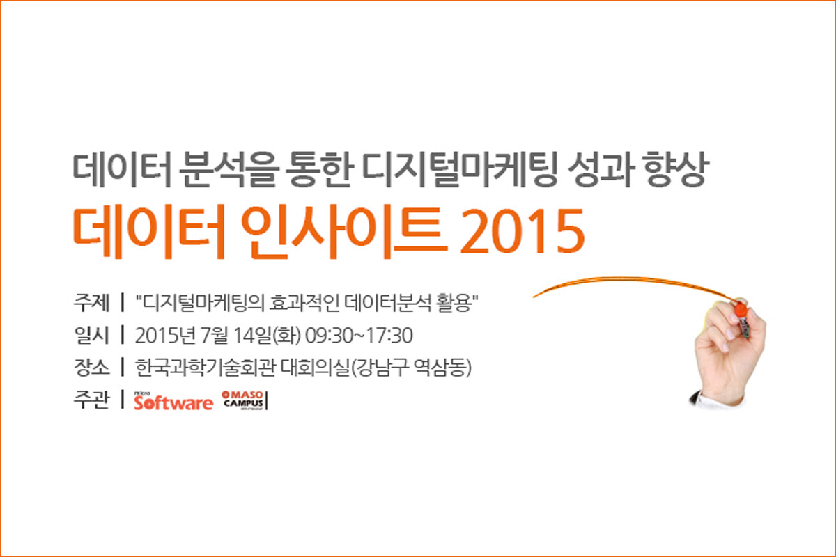 이번 행사는 디지털마케팅의 효과적인 데이터분석 활용이라는 주제로 열린다. 강연은 ▲디지털로의 전이, 생존게임의 시작 (옐로디지털마케팅그룹 이구환 센터장) ▲성과향상을 위한 지표설정 및 데이터분석 활용방안 (마소캠퍼스 김진 대표) ▲데이터분석을 통한 광고전략 (애드웨이즈코리아 이선진 대표) ▲개인화 데이터를 활용한 마케팅 자동화 (레코벨 박성혁 대표) ▲페이스북 데이터를 활용한 더 정교한 마케팅 (와이즈버즈 김종원 대표) ▲데이터분석으로 파헤치는 모바일게임의 성공비결 (탭조이 이상탁 팀장) ▲잡플래닛의 데이터 기반 마케팅 (잡플래닛 김지예 이사) ▲마케팅을 위한 데이터 프로파일링 (쿠팡 문석현 PO) 등이다.