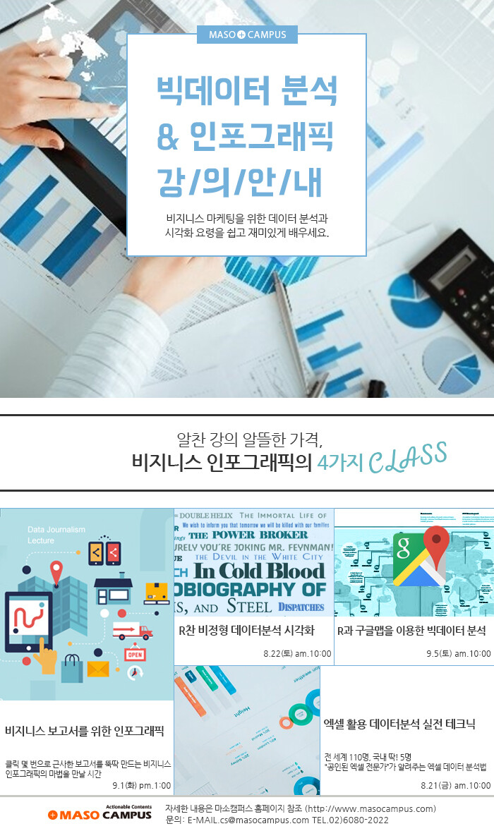 프레젠테이션은 천 마디 말보다 한 장의 그림이 더 낫다. 소비자와 투자자, 직장 상사를 위한 보고서 작성이 업무의 반인 직장인들을 위해 비즈니스 인포그래픽 교육 과정이 열린다. 마소캠퍼스가 비즈니스 인포그래픽 교육 과정을 개선했다. 파워포인트, 엑셀, 구글맵, 구글 퓨전테이블, R 등의 네 가지 과목으로 구성된 이번 교육은 수강생이 원하는 과목만 골라 들을 수 있다. 김진 마소캠퍼스 대표는 “누구나 빅데이터 분석 전문가가 될 필요는 없다. 이번 교육 과정은 직장인에게 꼭 필요한 비즈니스용 빅데이터 분석과 인포그래픽 실무 요령을 간추려 배우도록 기획했다. 엑셀이든 R이든 자기가 많이 쓰는 프로그램을 이용한 데이터분석 과목을 골라 듣는 게 좋다”고 밝혔다.